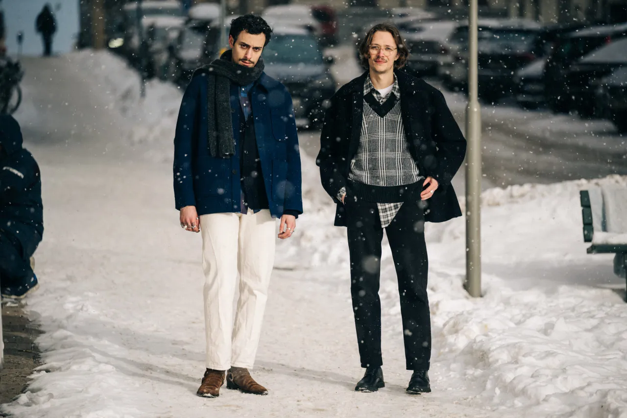 Dan wel weer zoals je ziet in neutrale kleuren. Allebei dragen de mannen Dr. Martens. Dus als je denkt dat die alleen voor vrouwen zijn, dan heb je het mis. Het ziet erin eerste instantie uit alsof er niet per se hun best is gedaan op de outfits, toch zie je aan dat er wel degelijk over na is gedacht. De rechter man draagt een cool pak in zelfde print. Ook aan accessoires is gedacht, een lekker hip vintage brilletjes en een paar super ongemakkelijke handschoenen.