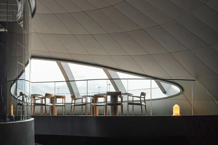 architectuur van de Salmon Eye bracht enkele uitdagingen met zich mee. Zo moest veel van het meubilair op maat gemaakt worden om naadloos aan te sluiten bij de gebogen wanden en hoeken. De verlichting is subtiel en straalt een zachte gloed uit, hoewel dat op de foto's nog niet echt naar voren komt. Maar als de nacht valt, dan komt de sfeer naar boven. Het geheel bestaat uit warme, natuurlijke tinten diein goede harmonie zijn met het schitterende natuurlandschap van het fjord.