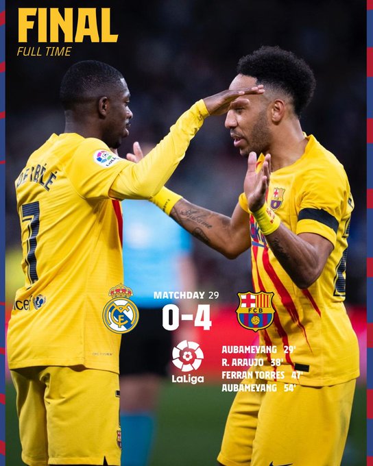 NOS kopte gister met een ‘pak slaag’ voor Real Madrid. Het Catalaanse Dario Sport sprak zelfs over een 'ontheiliging van Bernabéu als vanouds'. Over een ding was de mondiale pers het in ieder geval eens: Barcelona gaf Real Madrid voetballes gisteravond. Na een klein half uur opende Pierre-Emerick Aubameyang de score door een voorzet van Dembele binnen te koppen. Nog geen tien minuten later was het diezelfde Dembele die de tweede messteek voor Madrid inleidde. Uit een corner van de Fransman kopt Araujo binnen waarmee de Catalanen een comfortabele voorsprong hadden met rust. De woorden van Real-coach Ancelotti zullen ongetwijfeld hard zijn geweest in de rust. De club uit Madrid was nergens te vinden op het veld, veel van de thee zullen ze dus niet hebben kunnen genieten.