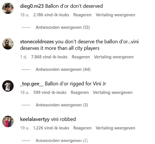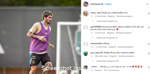 voetbal-Rodrigo (maar toch niet dé Rodri), kreeg een stortvloed aan reacties van Real-fans die dachten dat ze in hem misschien ook een goed doelwit hadden gevonden. Blijkbaar gaat het dit jaar bij de Ballon D'or niet om de winnaar, maar om welke Rodrigo een boze fan het snelst kan vinden op Instagram.