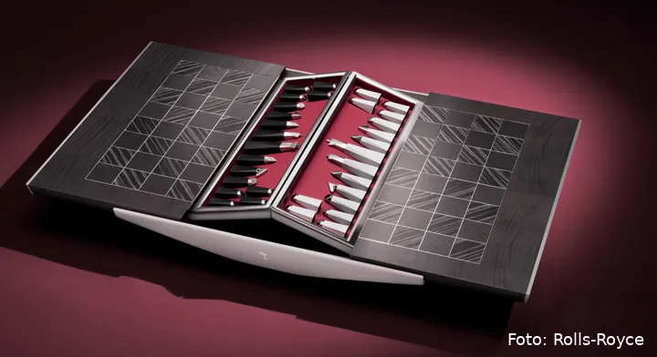 Rolls-Royce mag verwachten: met precisie, luxe materialen en oog voor detail. Geen hout of plastic, maar roestvrij staal. Zwaar, solide en met een strak, tijdloos ontwerp. Het bord zelf is afgewerkt met hoogwaardige materialen die ook terug te vinden zijn in de interieurs van Rolls-Royce-wagens. Aan één kant zit een schuiflade waarin je de stukken kunt opbergen. Alles klopt: van de strakke afwerking tot de manier waarop de stukken precies passen in de kussens van de lade.