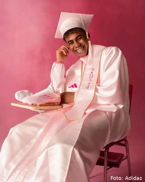 waarin Lamine in een knalroze graduation robe poseert, alsof hij nét cum laude
