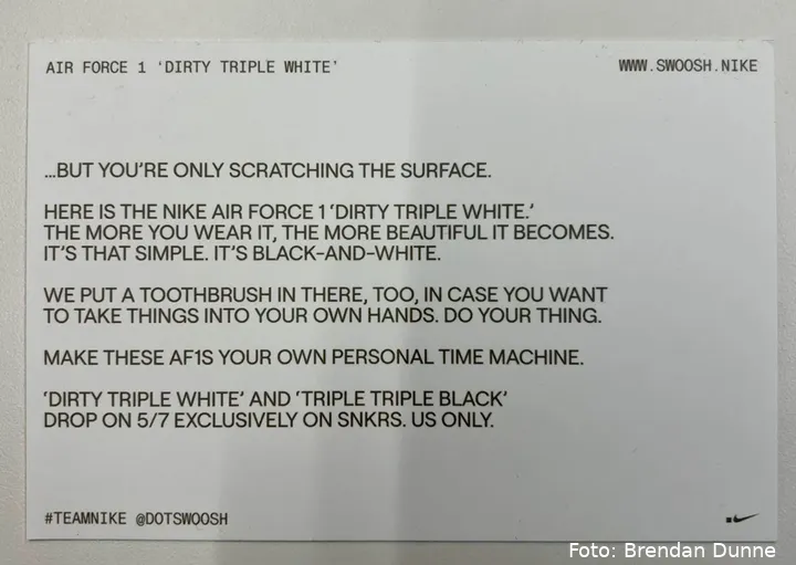 Nike draait het script volledig om: deze Air Force 1 sneakers worden schoon naarmate je ze draagt. Onder die ‘vuile’ bovenlaag zit namelijk een frisse, stralend witte schoen verborgen. En om je te helpen dat proces te versnellen, wordt er gewoon een tandenborstel meegeleverd. En het is niet de bedoeling om die voor je mond te gebruiken, maar voor je Nikes.