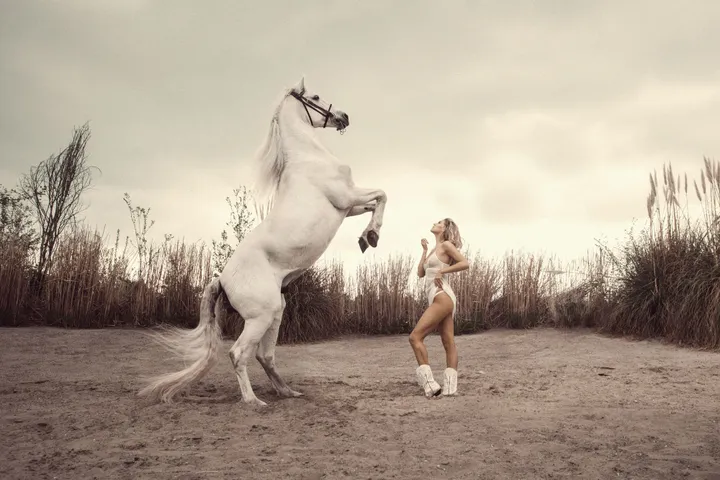 hik van krijgt, want op de foto’s schittert ze op een prachtig wit paard. Ook