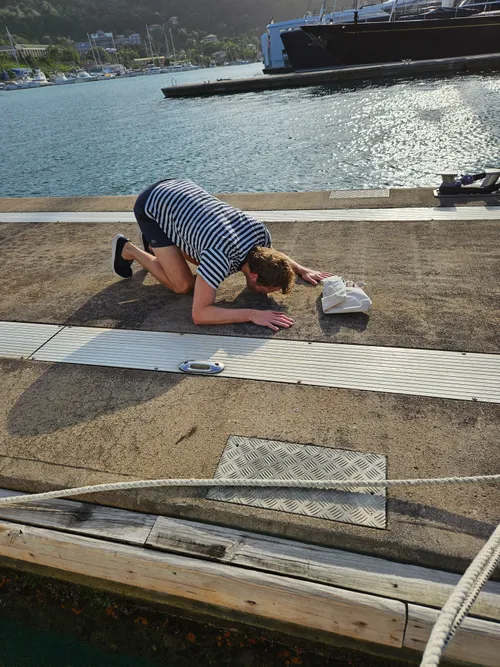 Vanaf ongeveer 50 kilometer afstand kun je voor het eerst land zien. Euforisch hijsen we de vlag van Grenada en omhelzen we elkaar. Het einde is in zicht! De scherpte was er wel meteen bij iedereen af. Toen gebeurde er iets. De wind draaide plots en Hugo krijgt de lijn van het grote zeil tussen zijn tenen. Het bloed spuit over het achterdek en de pezen hangen eruit. Via de satelliet maken we contact met een bevriende arts. Met hulp van mijn apotheek aan medicijnen drukken we de wond en de pijn. Nog 6 uur tot we aan land zijn. Bij aankomst gaat hij direct naar het ziekenhuis, terwijl ik word opgevangen door het welkomstcomité. De blijdschap houdt me overeind terwijl de zeebenen me bijna tegen de grond werken.