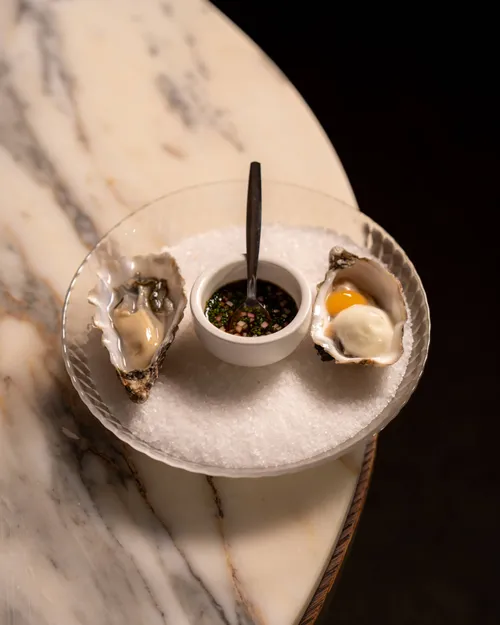 We trappen af met oesters in twee stijlen: eentje fris, met grapefruit en yuzu-schuim en eentje smoky, met een dot kaviaar erop. Zoals de chef van Bistro Féline zelf zegt: "kan nooit kwaad." En gelijk heeft ‘ie.