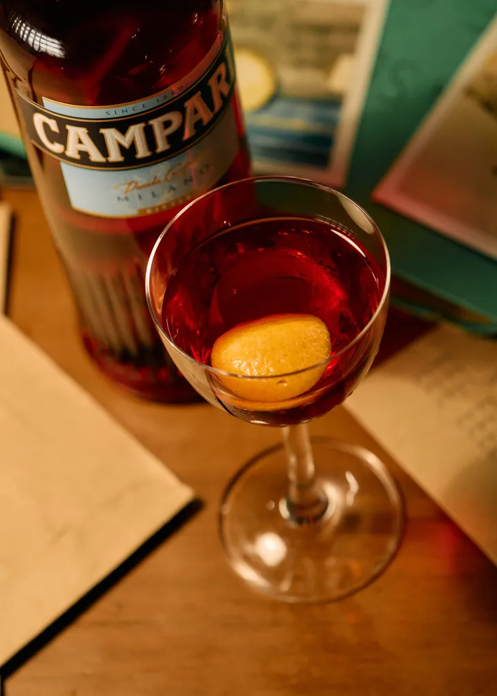 Het recept is simpel maar treffend: gooi wat ijs in een mooi laag glas, mix Campari, gin en rode vermout in gelijke delen (idealiter 30 ml van elk), roer het goed door elkaar heen, en finish ‘m met een half schijfje sinaasappel. Salute!