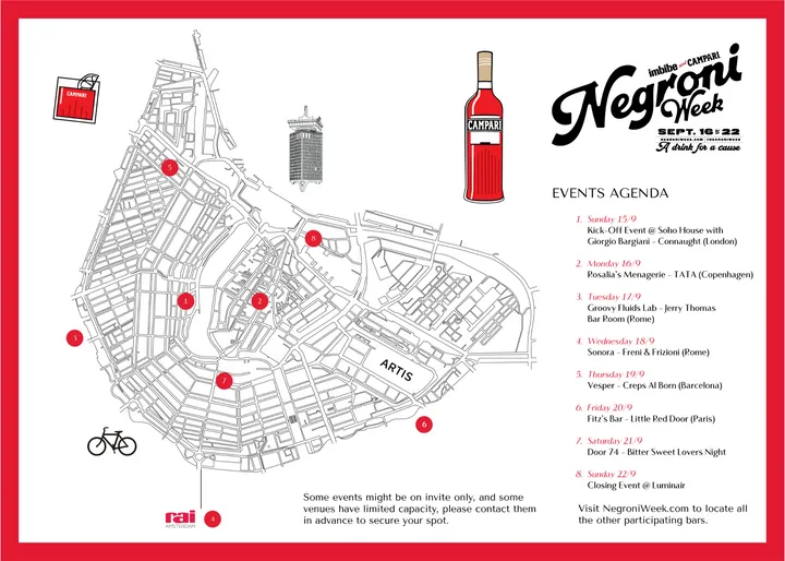 Amsterdam om voor één avond een bar over te nemen. Maandag 16 september is bar Tata uit Kopenhagen te vinden in Rosalia’s Menagerie. Op woensdag de 18de halen Selva & Sonora #33 in World’s Best Bars uit Rome naar Amsterdam. Fitz’s Bar in het Pillows Hotel host op vrijdag 20 september bar Little Red Door uit Parijs, de nummer 6 van de wereld. Op zondag sluit Negroni Week af met een party bij LuminAir.
