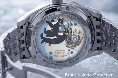 Nivada Grenchen komt met een opvallend nieuw horloge: de Antarctic Erotic. Het merk staat al sinds de jaren '50 bekend om zijn horloges voor poolexpedities, met de pinguïn als vast logo. Dit keer krijgt dat symbool een andere twist. Aan de voorkant ziet het horloge er stijlvol en klassiek uit, maar aan de achterkant zit een geheim verstopt. Daar zie je namelijk een bewegende afbeelding van twee pinguïns die het wel heel gezellig hebben met elkaar. Dit nieuwe model is een knipoog naar de historische 'erotische horloges'. Vroeger was het in de horlogewereld een traditie om verborgen, ondeugende afbeeldingen in het uurwerk of onder de kast te verwerken. Nivada Grenchen brengt die traditie nu terug naar 2026.