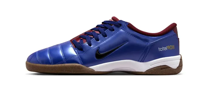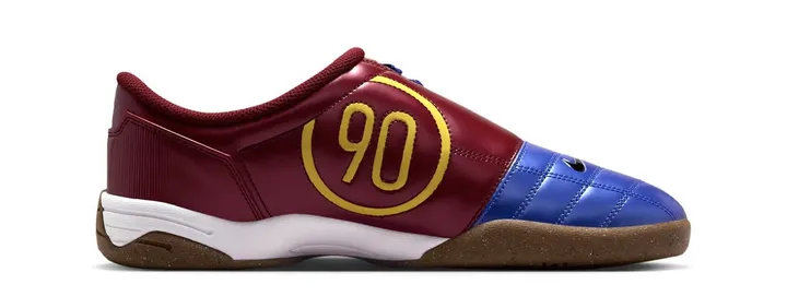 FC Barcelona, met een verfijnde leren bovenkant. Het rijke donkerblauw siert de zijkanten en de tenen, terwijl rood onder meer de hiel omhult. Het gouden "90" logo, de inlegzolen en de "90III"-symbooltjes voegen een luxueuze flair toe aan het geheel.