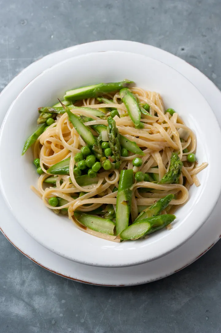 Hoe? Smelt de helft van de boter met de olie in een ondiepe pan op middelhoog vuur. Fruit de lente-uitjes in 3-5 minuten zacht en glazig. Voeg de erwten en asperges toe, doe er zout en peper naar smaak bij, roer er het hete water door en laat alles 25 minuten pruttelen. Kook intussen de bavette in veel kokend water met zout beetgaar. Laat ze uitlekken, doe ze in de pan met de groenten en roer. Meng er de rest van de boter en de Parmezaanse kaas door en dien ze op.