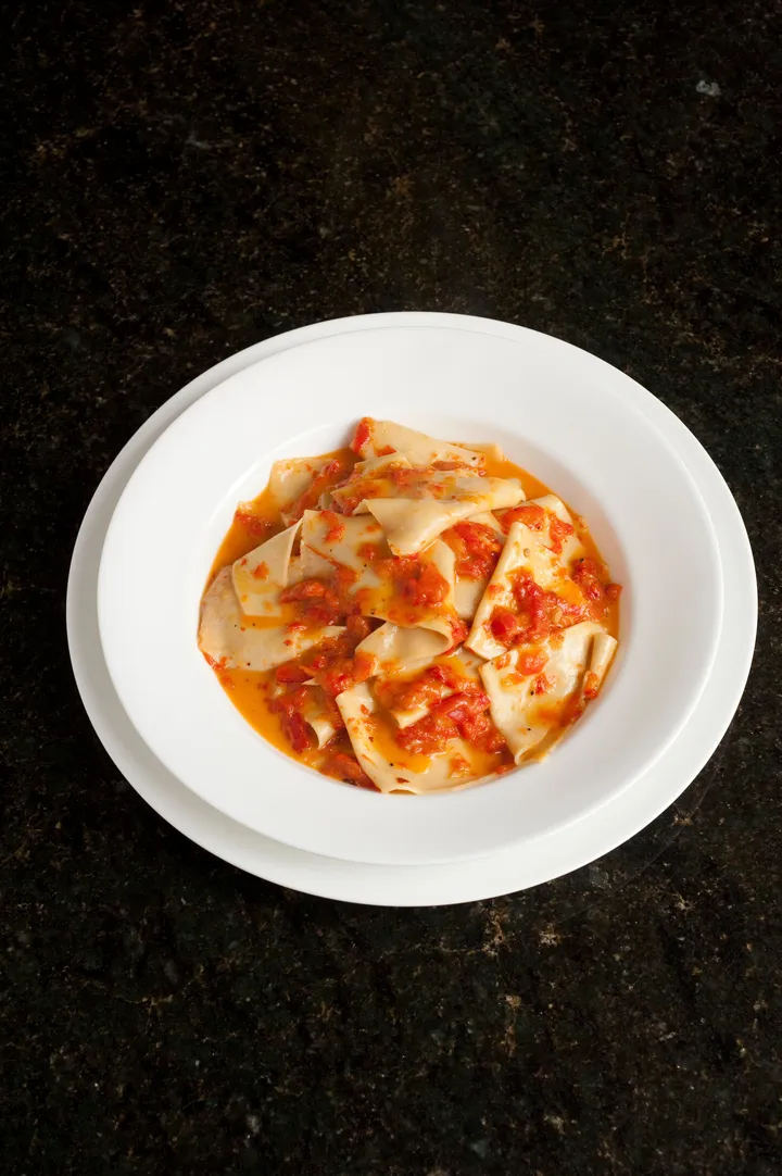 Hoe? Verhit de oven tot 200°C (gasovenstand 6). Leg de paprika’s op een bakplaat en zet ze 1 uur in de oven. Haal ze eruit, wikkel ze in aluminiumfolie en laat ze 1 uur afkoelen. Haal de paprika’s uit het folie, verwijder de geblakerde vliezen en de pitjes en snijd ze in lange repen. Doe ze met de olie en een mespunt zout in een keukenmachine of blender en draai er een puree van. Verhit de puree voorzichtig in een pan. Kook de maltagliati in veel kokend water met zout in 2-3 minuten beetgaar. Laat ze uitlekken, doe ze in een warme schaal en overgiet ze met de hete saus. Zet het gerecht meteen op tafel.