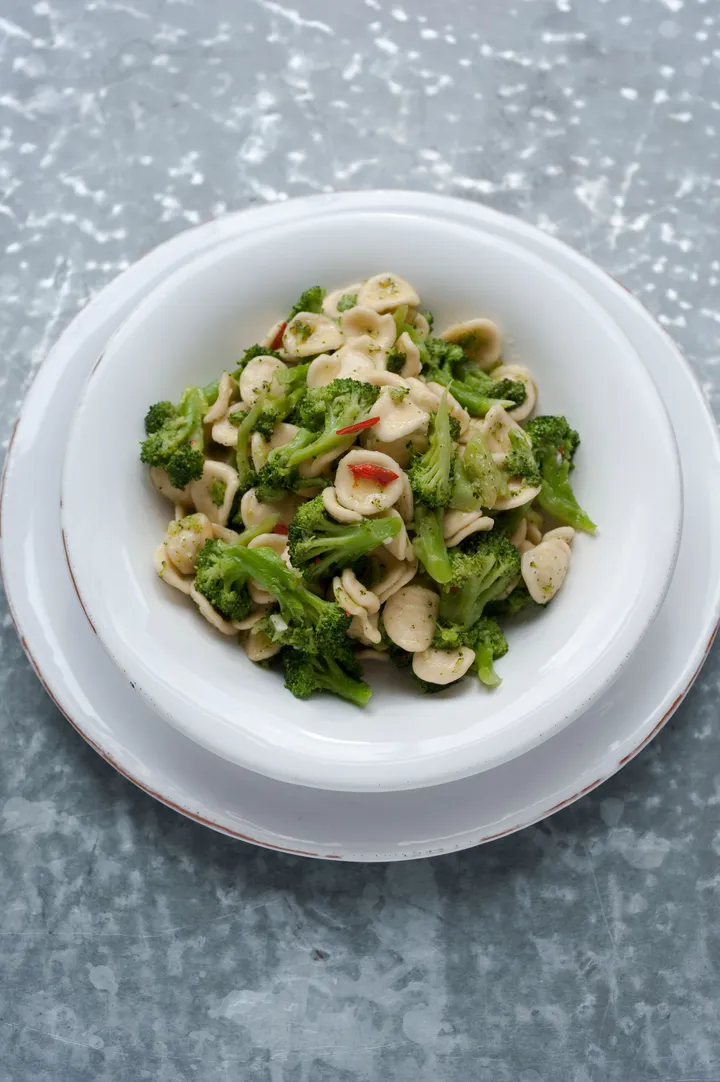 Hoe? Kook de roosjes broccoli 5 minuten in water met wat zout en laat ze uitlekken. Verhit de olie in een pan, doe er de knoflook en chilipeper bij, bak ze 3 minuten, voeg de roosjes toe en bak ze in 5 minuten op laag vuur gaar; roer af en toe. Kook intussen de orecchiette in 2-3 minuten in ruim water met zout beetgaar. Laat ze uitlekken en roer ze door de broccoli. Geef er Parmezaanse kaas of pecorino bij. Tip: U kunt de broccoli ook samen met de orecchiette gaar laten worden. Laat in dat geval alles uitlekken, druppel er olijfolie over en bestrooi het gerecht met geraspte pecorino. Ook bepaalde soorten gedroogde pasta zijn bruikbaar, bijvoorbeeld rigatoni.