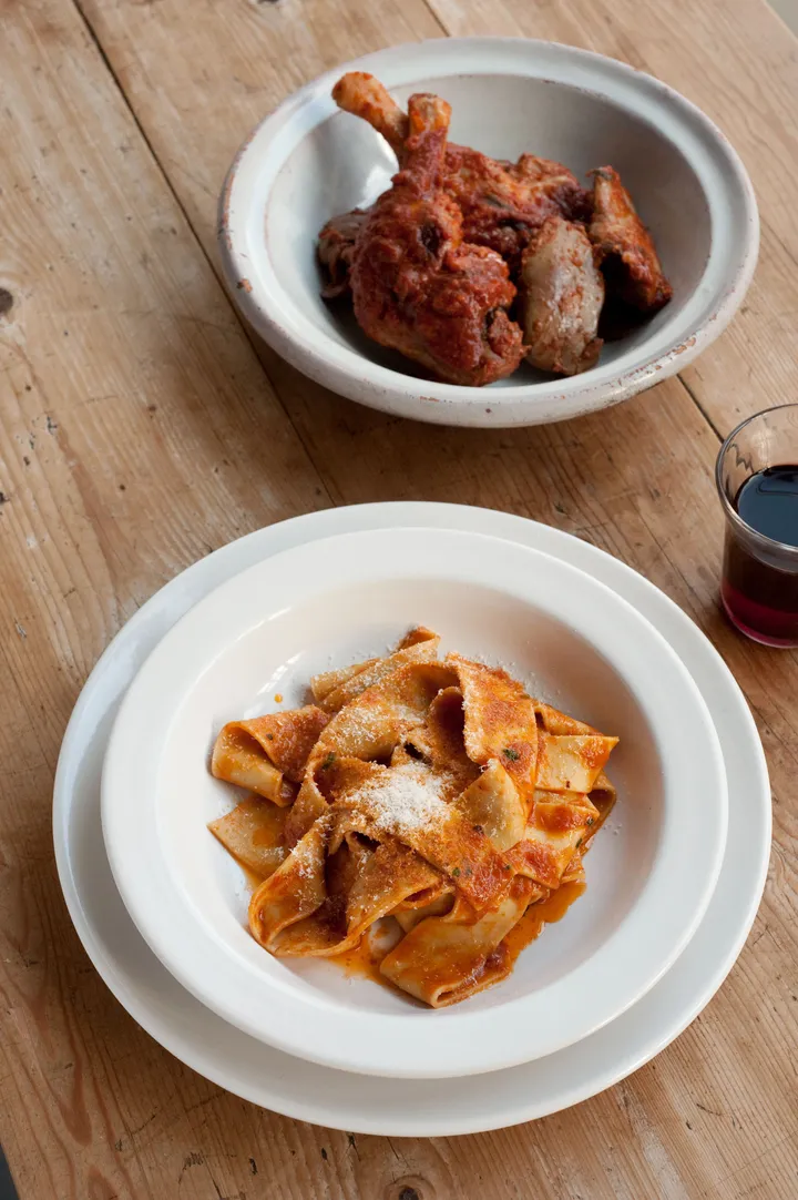 Hoe? Verhit de olie in een ondiepe pan. Voeg de ham, ui, bleekselderij en wortel toe en bak ze 5 minuten op laag vuur; roer af en toe. Bak de stukken eend mee tot ze egaal lichtbruin zijn; roer vaak. Giet er de wijn bij en laat de alcohol verdampen. Roer er de tomaten door, voeg salie en basilicum toe en doe er zout en peper naar smaak bij. Laat alles afgedekt circa 1½ uur pruttelen of tot het vlees gaar is; roer af en toe. Voeg 10 minuten voor het eind van de kooktijd de lever toe. Haal de stukken eend uit de pan en houd ze warm. Giet de saus door een zeef in een kom en druk met de achterkant van een lepel zo veel mogelijk vocht uit de groenten. Kook de pappardelle in veel kokend water met zout in 2-3 minuten beetgaar. Laat ze uitlekken, doe ze weer in de pan, overgiet ze met de saus, voeg boter toe en roer. Bestrooi ze met Parmezaanse kaas, schep ze in een warme schaal en zet het gerecht meteen op tafel. Geef de eend er apart bij. De Toscaanse keuken is simpel maar smakelijk, met de nadruk op alle soorten vlees: aan het spit, gegrilleerd of in een heerlijke saus.