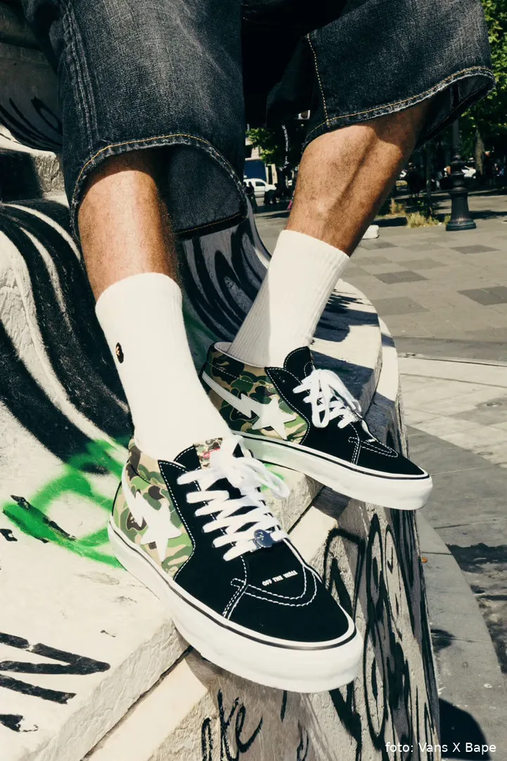 En dan hebben we nog de Vans x BAPE Sk8-Mid. Dit model is helemaal ondergedompeld in BAPE’s groene camouflagepatroon. Net als bij de Old Skool pronken de woorden "A Bathing Ape" en "Off the Wall" in witte letters op het gitzwarte voorblad (de bovenkant). Natuurlijk ontbreekt ook hier de Ape Head-charm niet en is de Sidestripe opnieuw voorzien van dat coole BAPE-stempeltje. Deze sneakers zijn niet alleen stijlvol, maar ook een ode aan de straatcultuur waar beide merken zo van houden.
