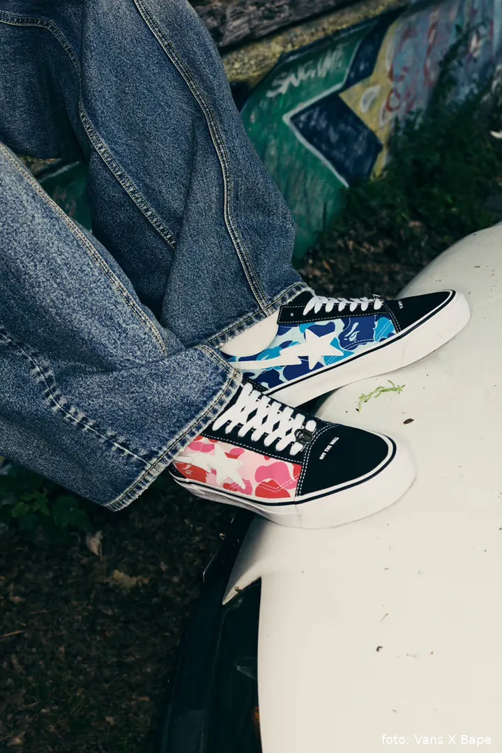 Vans-webshop en in BAPE’s fysieke winkels. De Old Skool en de Sk8-Mid gaan voor ongeveer €100 euro over de toonbank. Een koopje voor zo’n kunstwerk, toch?