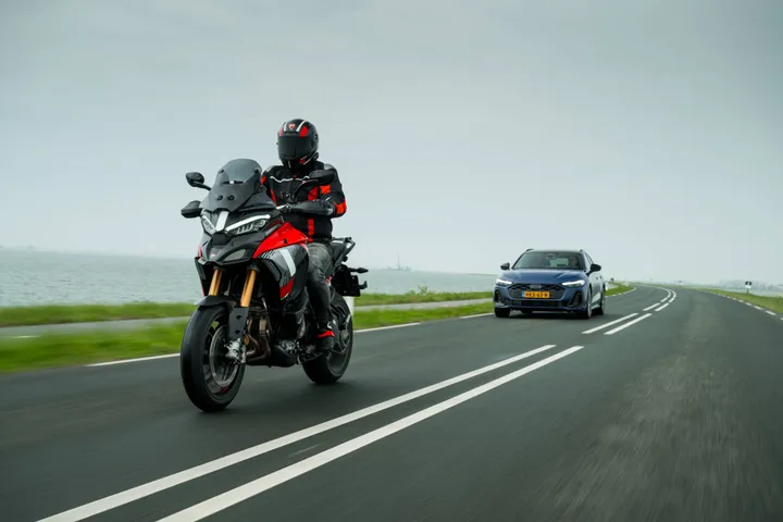 Er zijn van die dagen waarop alles klopt. De zon staat hoog, de motoren grommen ongeduldig en wij staan met een vers getapte cappuccino in de hand tussen het mooiste dat Italië en Duitsland samen kunnen bouwen. We melden ons in Amsterdam voor de Ducati x Audi Immersive Driving Experience, een soort familiedag waarop beide merken een paar van hun beste paarden van stal hebben gehaald om kennis mee te maken. Als we aankomen bij Ducati Amsterdam zien we de line-up van de Italianen al op scherp staan. Met de Multistrada V4 Pikes Peak, Streetfighter V4 en de Panigale V4 zijn de paradepaartjes van de Italianen uit de showroom gehaald om eens even lekker buiten te ravotten.