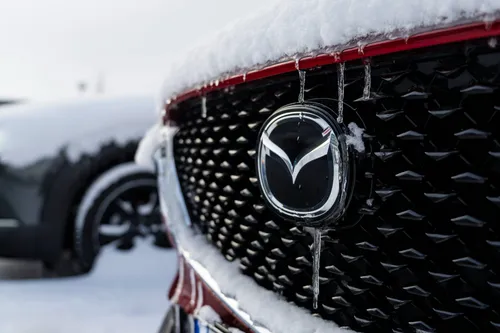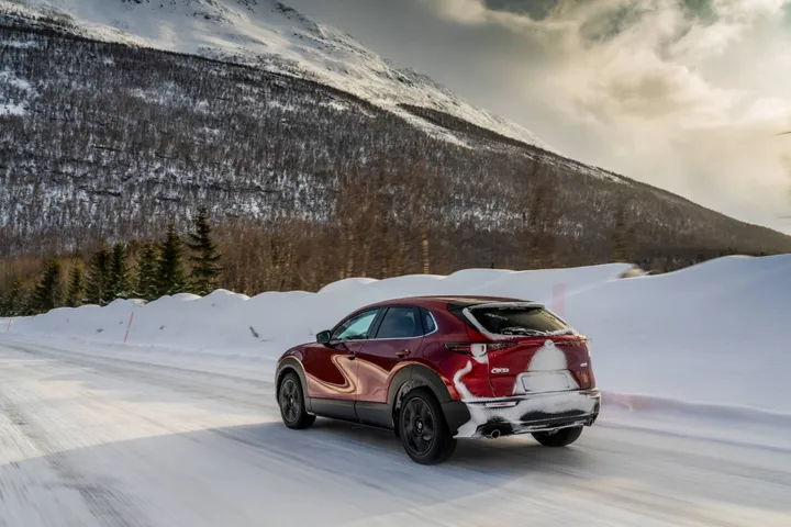 Het is opvallend hoeveel grip de Mazda CX-30 heeft op de spekgladde wegen. Je zou verwachten dat je door elke bocht kan driften, maar niets is minder waar. Dankzij de subtiele spikes banden heb je aan controle geen gebrek. De Mazda CX-30 is onderhuids voorzien van een nieuwe 2.5 e-Skyactiv motor, goed voor 140 pk een een koppel van 238 Newtonmeter bij. Nou is dit niet de omgeving om eens vol te gaan trappen, maar het is meer dan genoeg vermogen. In vergelijking met de laatste 2.0 liter motor, beschikt de nieuwe 2.5 over meer koppel in het lage en middengebied van het toerental.
