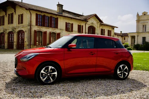 Sinds 2004 is de Japanse autofabrikant bezig met de Swift. Na een drietal releases van de auto, is het in 2024 tijd voor de vierde generatie. Voordat we instappen, worden we naar de persruimte begeleid om informatie in te winnen over de nieuwe bolide. In de parkeergarage naast het hotel zijn meerdere verdiepingen gevuld met de nieuwe Swift. Wij krijgen er eentje met een Burning Red Pearl Metallic kleur. Mooi rood is nog altijd niet lelijk en dat geldt zeker op deze Swiffer.