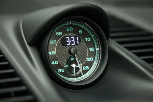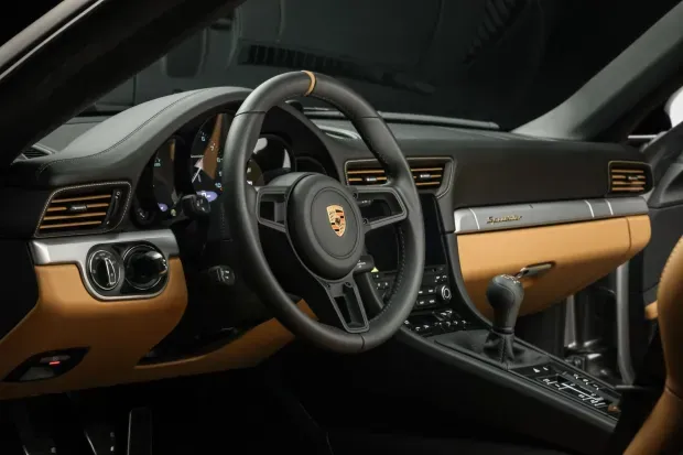 Het interieur van de wagen is een ode aan luxe en exclusiviteit. De carbon stoelen zijn in volledig Cognac-leer bekleed, wat een mooi contrast geeft aan het zwarte dashboard van deze Porsche. Met de eerder benoemde Heritage Design en Chrono pakketen, krijgt deze Porsche een historisch maar sportief sausje. Het mooiste van dit alles? Met maar 71 kilometer op de teller, koop je ‘m praktisch gezien ook nog eens in nieuwstaat over.