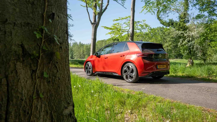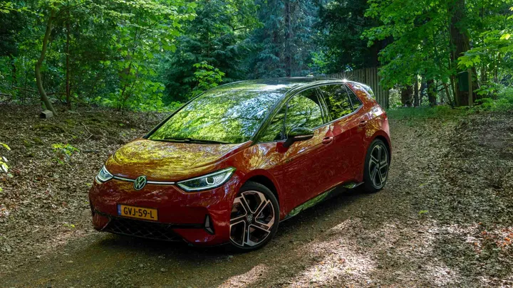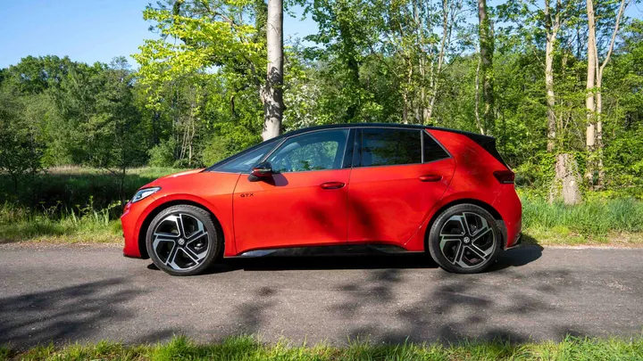De ID.3 GTX Performance laat ook in stilstand zien dat hij wat extra spierballen heeft gekregen. Denk: agressievere bumpers, dikke 20-inch velgen en subtiele GTX-badges. Onze testauto kwam in het opvallende Kings Red, waarin ‘ie echt opvalt, zeker in een bosrijke omgeving.