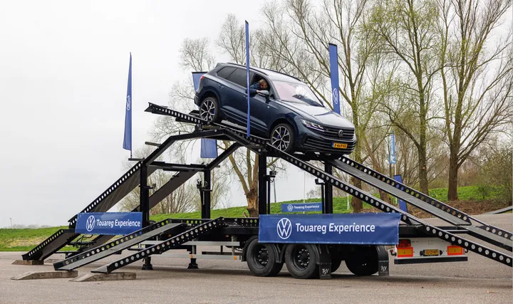 Als we aankomen bij de testbaan in Lelystad zien we dat er een heel parcours voor ons is uitgestald, met verschillende onderdelen. We zien een combinatie met speedboot achterop, een combinatie met een Volkswagen ID. Buzz achterop en een combinatie met een paardentrailer. Yep, dit gaat vet worden. Niet alleen de combinaties, maar ook de gigantische brug waar we overheen gaan rijden ziet er cool uit. Na een korte uitleg mogen we beginnen bij het meest enthousiasmerende onderdeel: de brug. Of we er overheen willen rijden? Vanzelfsprekend! Nadat we eerst mee zijn geweest met een instructeur, krijgen we zelf de macht over het stuur. Omhoog rijden is even spannend, maar het kiepen van de brug is eigenlijk het weerzinwekkendste. Met een harde klap kiepen we om en eindigen we op de andere kant van de brug. Vervolgens verzoekt de instructeur ons om de rem en het gas los te laten, maar alsnog razen we niet naar beneden. Dit komt door het slimme hulpsysteem van de auto dat ervoor zorgt dat we niet ongecontroleerd naar beneden stiefelen.