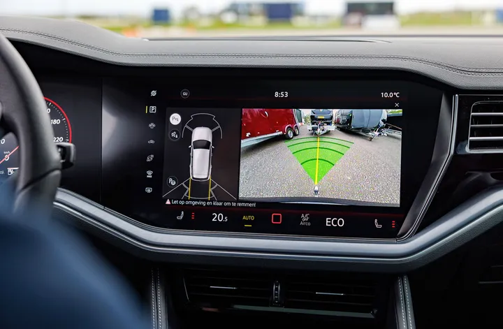 aanhanger gereden, maar is alles behalve in het bezit van een BE rijbewijs. Vooruit rijden met een aanhanger is eigenlijk kinderspel, maar als je de tegenovergestelde richting in moet ben je verder van huis. Tóch blijkt dat met de Touareg eigenlijk makkelijker te zijn dan wij voor ogen hadden. Door een functie genaamd "trailer assist’" hebben wij geen moeite met achteruit manoeuvreren met een paardentrailer aan de trekhaak. Als we de auto in zijn achteruit zetten, krijgen we de optie om deze functie in te schakelen. We hoeven het stuur niet meer aan te raken en kunnen met de knop waar je normaal je spiegels mee afstelt onze aanhanger zo positioneren hoe wij willen. Het is eigenlijk een soort van joystick waarmee je speelt, alleen nu is het geen game maar je eigen aanhanger die je bestuurt. Door de combinatie van de joystick en het heldere infotainment scherm is het besturen van de aanhanger eigenlijk peanuts. Het werkt namelijk zo: als je op het scherm de aanhanger positioneert en daarna gas geeft, zorgt de auto ervoor dat hij zichzelf er recht voor zet. Hierdoor gaat de aanhanger heen waar jij wilt en dat zonder 16x te steken of je vrouw achter de auto te zetten die keihard ‘’stop’’ roept als je bijna de fiets van de buurman raakt.