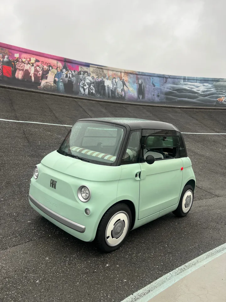 FIAT ademt. We rijden naar het dak van het Lingotto-gebouw (waar ooit auto’s werden getest), en de Topolino is niet onder de indruk van de scherpe bochten op het testcircuit. Het is een perfecte combinatie van praktisch en speels, en laat je niet in de steek, zelfs niet als de regen met bakken uit de lucht komt vallen.