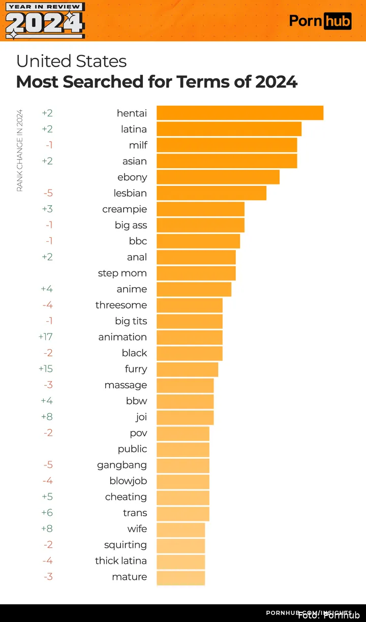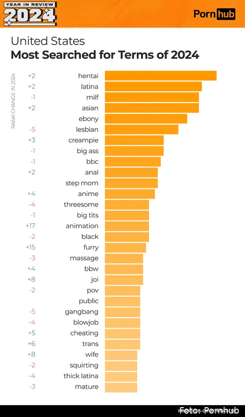 De viral video van Haliey Welch die de tem ‘Hawk Tuah’ in de wereld blies zorgde voor een explosie aan zoekopdrachten naar ‘spit on dick’ (+233%). Andere bekende zoektermen waren ‘hentai’, ‘Latina’ (als we het al niet wisten), ‘milf”, ‘Asian’, en natuurlijk de standaar ‘big ass’. Tja, wat kunnen we zeggen?