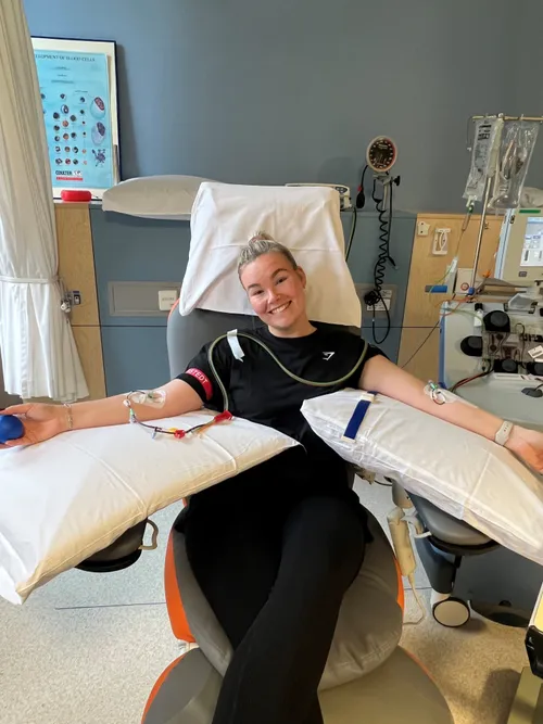 Het is augustus 2023, nog geen drie maanden nadat Sabine de staafjes met haar wangslijm heeft teruggestuurd. “De telefoon gaat, Matchis aan de lijn: er is een match… Totaal onverwacht en ook zo snel!” Sabine denkt er niet lang over na. “Wie A zegt, moet ook B zeggen.” Ze wordt door Matchis uitgenodigd in Nijmegen voor een medische keuring om te kijken of ze gezond genoeg is om te doneren. Dat blijkt het geval. Een afspraak voor de donatie van haar stamcellen is daarop snel gemaakt. Een aantal dagen voor de donatie ontvangt Sabine kleine naaldjes waarmee ze bij zichzelf een medicijn moet toedienen. “Dit zorgde ervoor dat mijn stamcellen zich vanuit mijn beenmerg naar mijn bloedbaan zouden verplaatsen. Als bijwerking hiervan heb ik alleen wat spierpijn ervaren.”